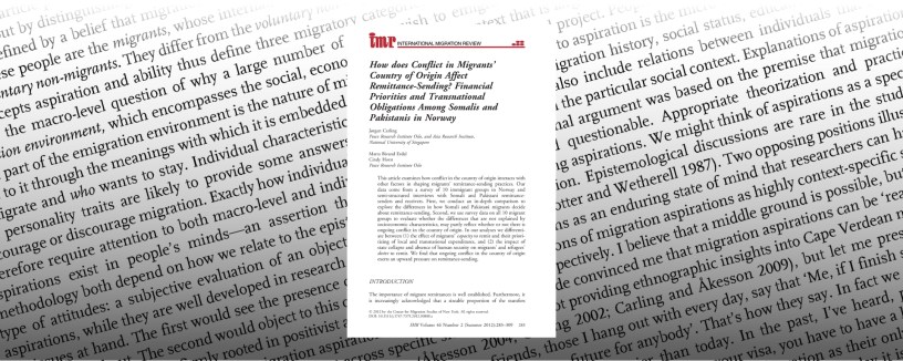 Carling, Jørgen; Erdal, Marta Bivand and Horst, Cindy (2012) ‘How does conflict in migrants’ country of origin affect remittance-sending? Financial priorities and transnational obligations among Somalis and Pakistanis in Norway.’ International Migration Review, 46(2): 283-309.