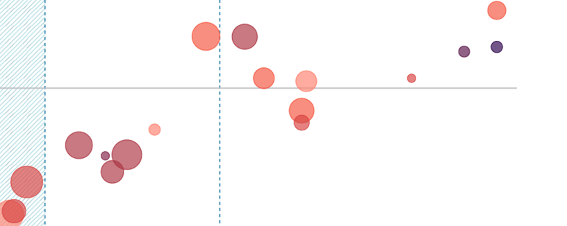 Now, lets consider degrees of statistical certainty. The country markers are scattered along the two dashed curves in the figure. The greater the effect size – whether positive or negative – the greater the certainty that hunger makes a difference. This is as expected, and not really a finding in its own right. So, while trend lines are often seen as the key take-aways from scatter plots, they are the least interesting element here.