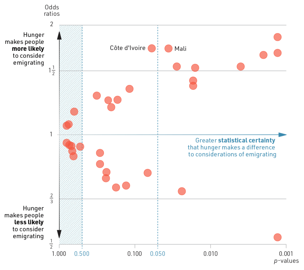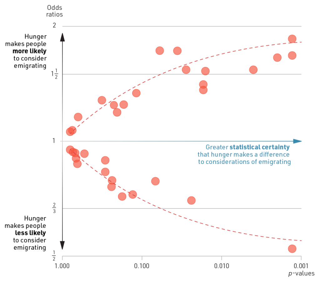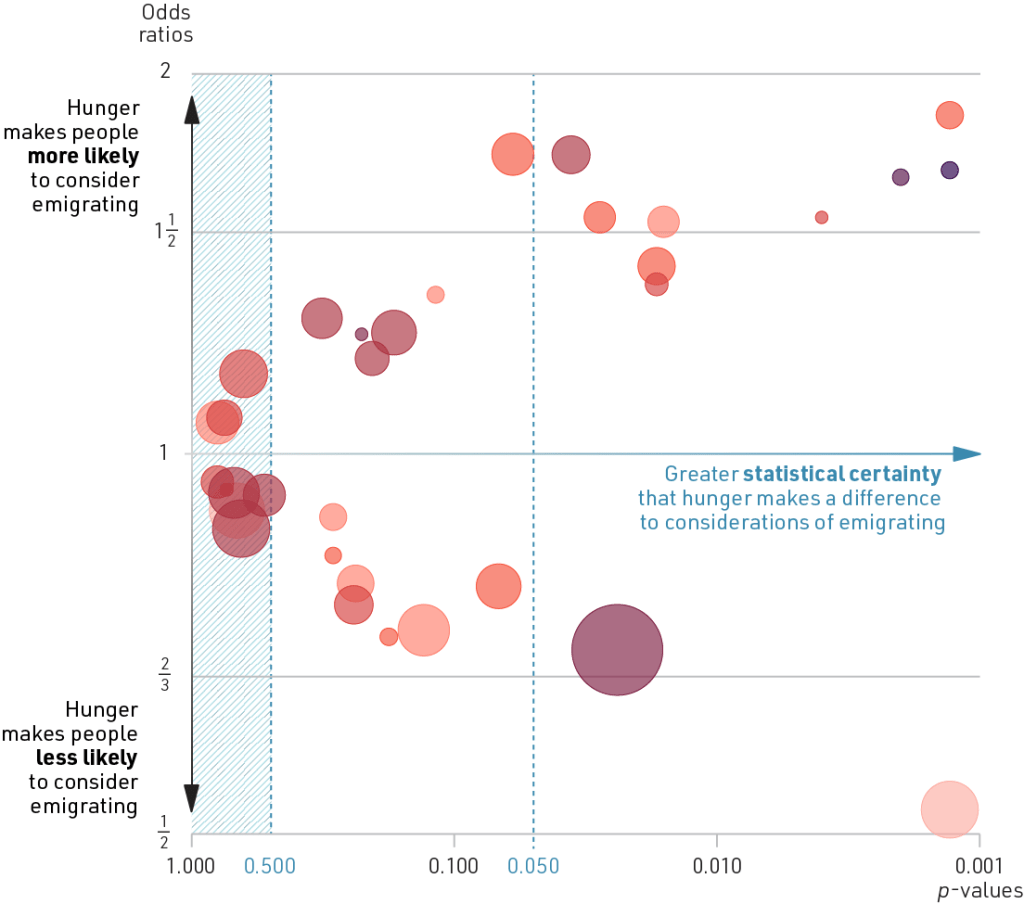 The starting point is to take effect size (odds ratio) and statistical uncertainty (p-value) as the axes in a scatter plot and add a marker for each country. I have used the vertical axis for the effect size, since it is intuitive that big increases and decreases are at the top and bottom of the figure, respectively. So if a country marker is placed near the top, it means that people who’ve experienced hunger are much more likely to consider emigrating than those who have not.