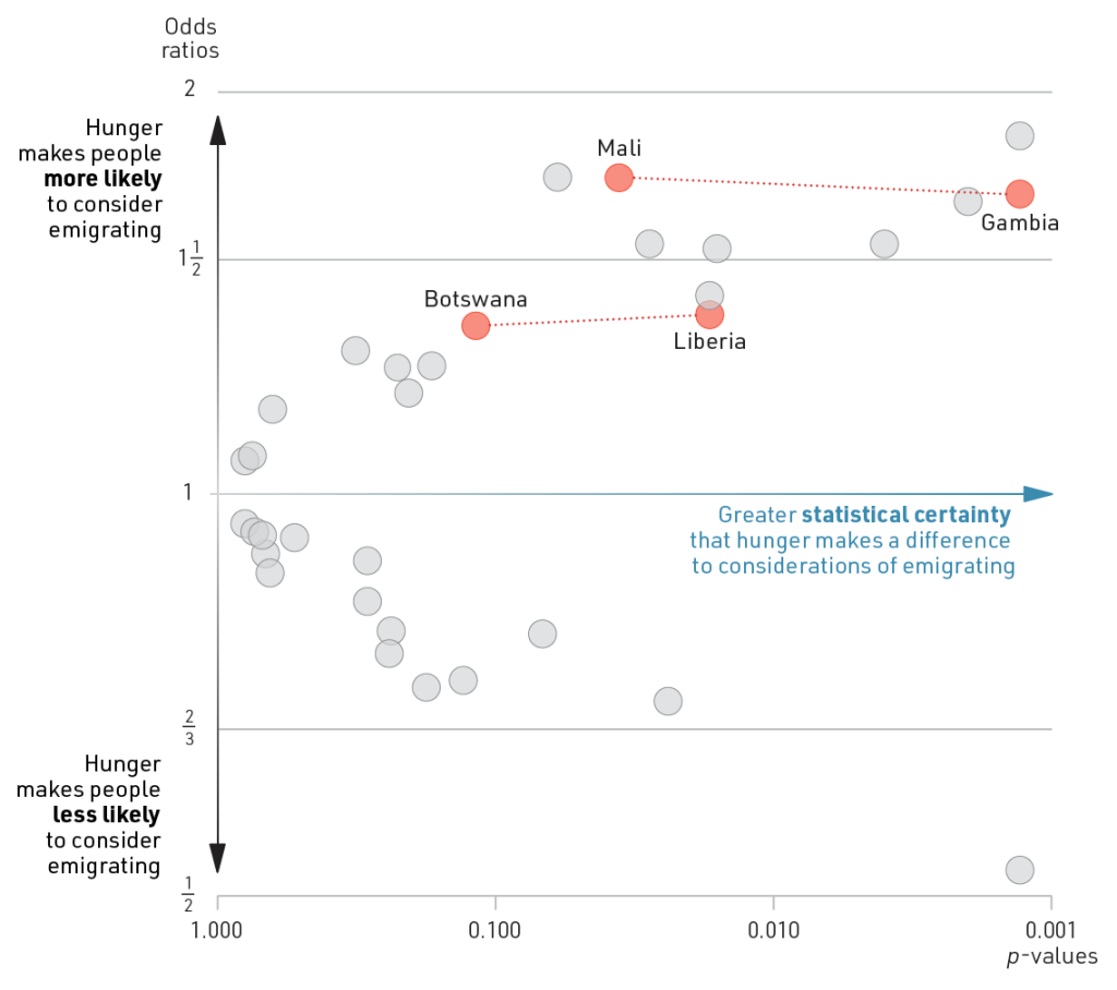 Instead, it’s worth looking at how statistical certainty varies between countries where the effect size is roughly the same. That’s the case with Mali and The Gambia, for instance. The main reason why the result in Mali is much less certain, is that only 11% of Malians are considering emigrating, compared with 29% in The Gambia. This means that the estimated effect of experiencing hunger is based on responses from a smaller number of individuals. As a consequence, it is less certain that the survey data reflects the population as a whole. For the same reason, the effect in Botswana is less certain than the similarly-sized effect in Liberia.