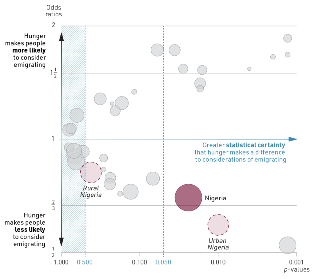 Are people who experience hunger more likely than others to think about emigrating? That’s a reasonable assumption, for instance in light of historical examples such as the massive Irish emigration in the wake of famine in the mid-1800s. But the opposite argument is also convincing: people who live from hand to mouth don’t have capacity to think about something as overwhelming and complex as moving to a different country.
